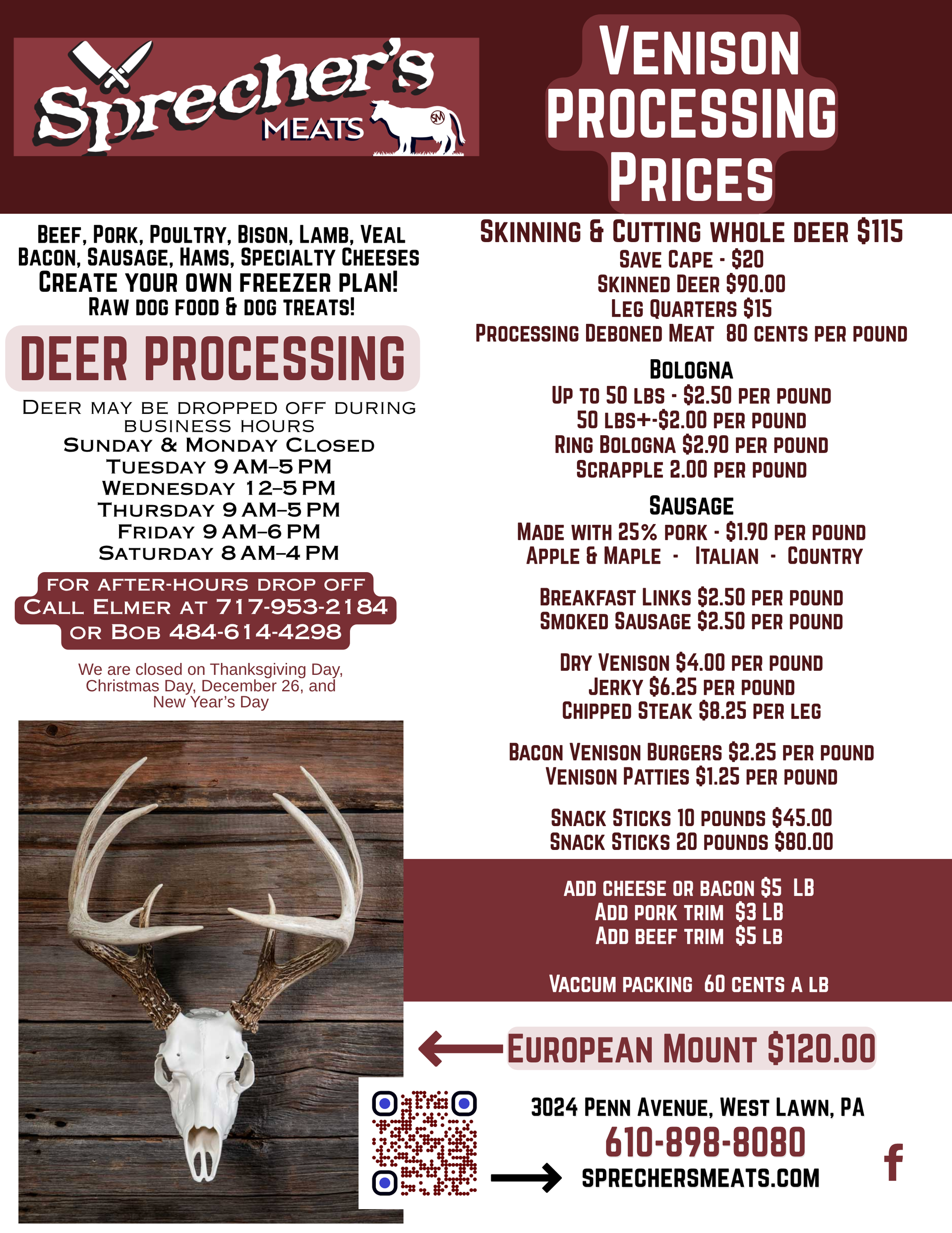 We also offer processing services, including deer processing and other specialty requests. Our team handles each order with care to ensure quality from start to finish.